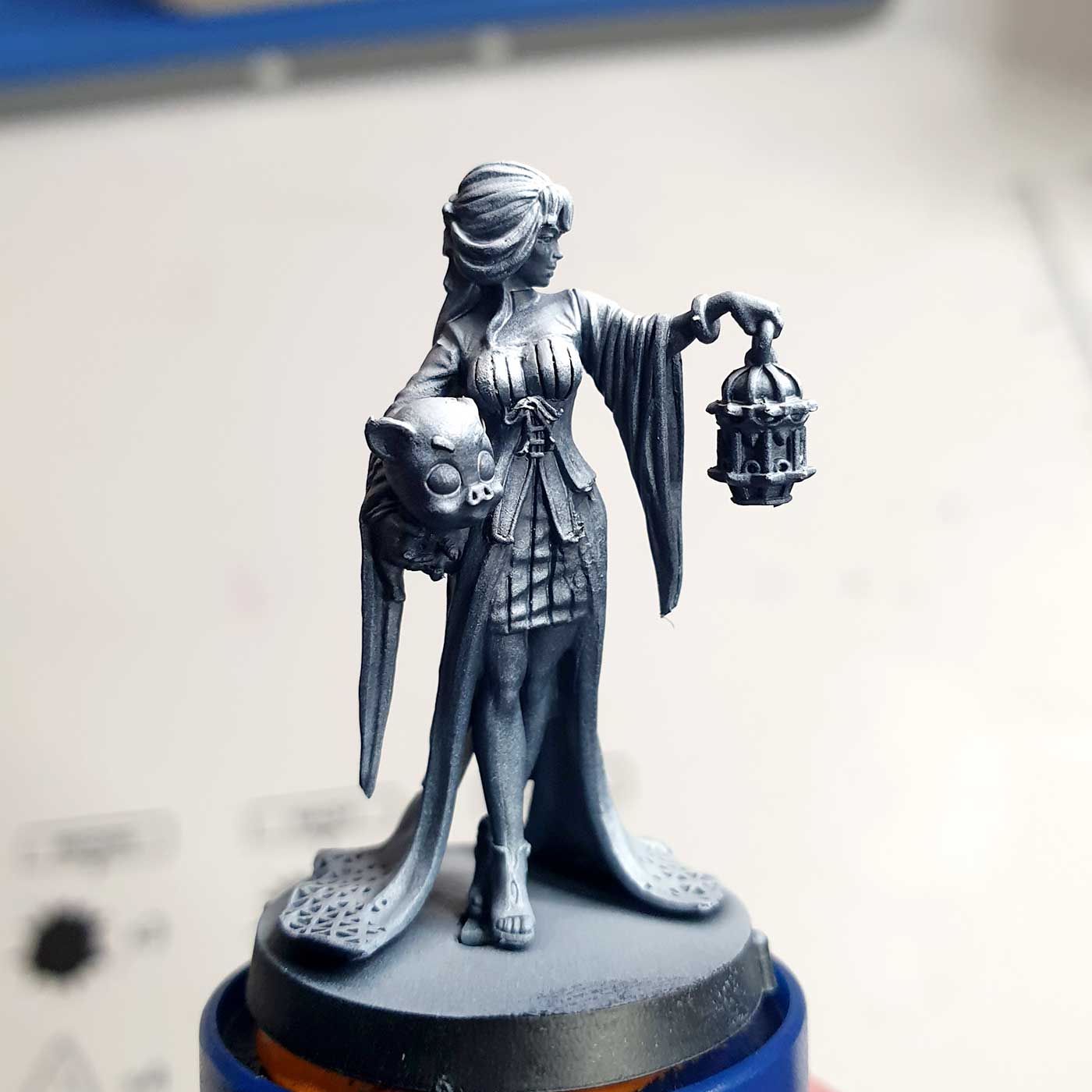 To start, I assembled the mini with superglue. Unlike minis you may be used to, these are metal, so plastic cement will be useless here. I also used heavy clippers for this as metal could blunt or break my precision nippers I use on plastic models. I made a hole in the base so the ‘tab’ the model stands on could slot in. With heavier metal models like this stability is important! My RGG360 painting handle came in handy to hold the dragon lady during the painting session.